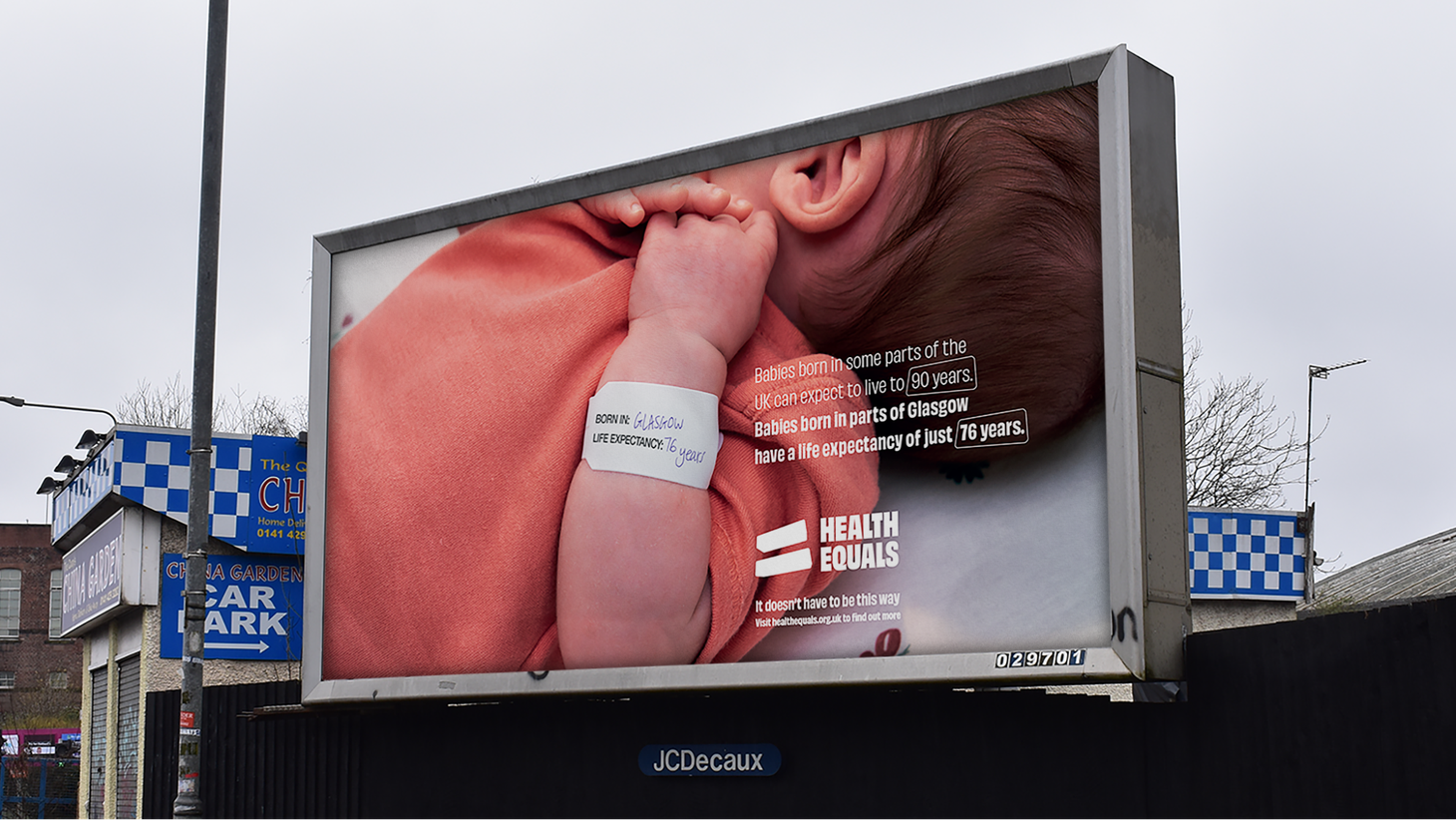 - Traditional Marketing: Billboards were strategically placed in Sheffield and Glasgow—two cities with some of the UK's lowest life expectancies. These billboards featured poignant images of newborn babies with a startling twist: their life expectancy, determined solely by their birthplace, was displayed on their hospital wristbands. This physical and localised presence created a visceral, unavoidable connection to the issue.